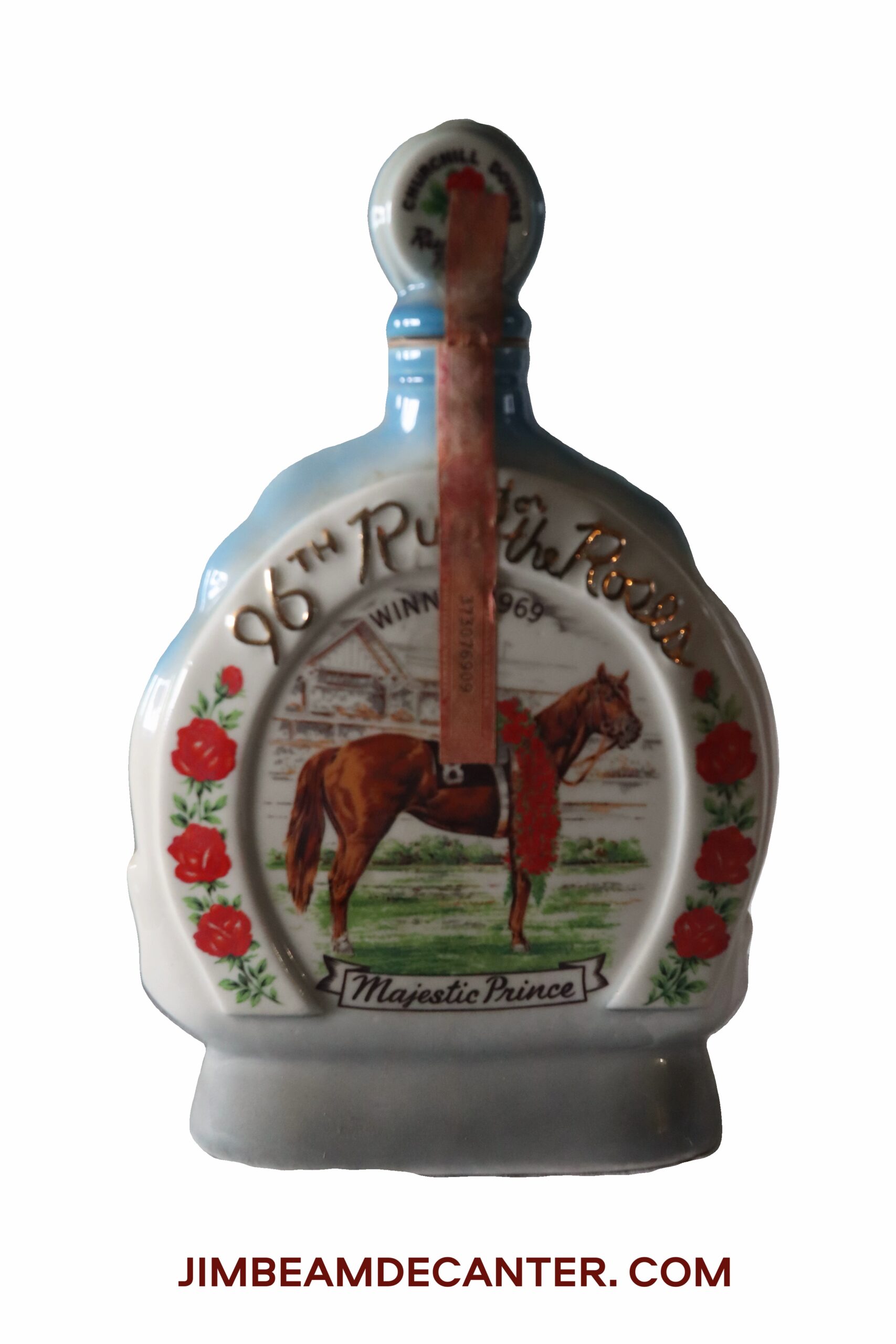 The first bottle issued to commemorate the 95th “Run For the Roses” bore read roses embossed on the face of the decanter. However, they were not the desired shade so the remainder of the decanters were issued with garlands of pink roses. Those with the read roses were fewer in number. “Majestic Prince race horse was featured in center of decanter. Height 10 3/4 inches.